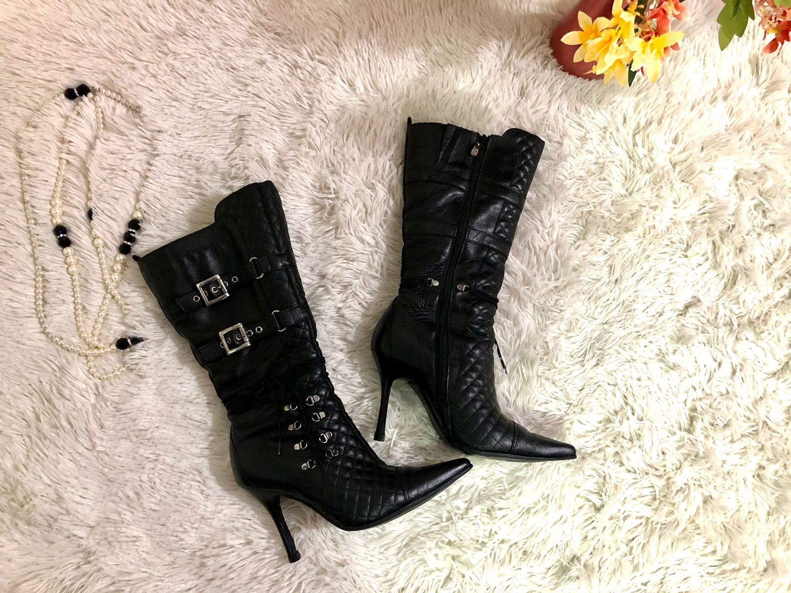 Linda bota em salto alto couro legítimo, está simplesmente impecável. O solado de borracha foi refeito em sapateiro especializado, tendo em vista que a borracha se desgastou. Bota sem detalhes, tamanho 36. Super maravilhosa.