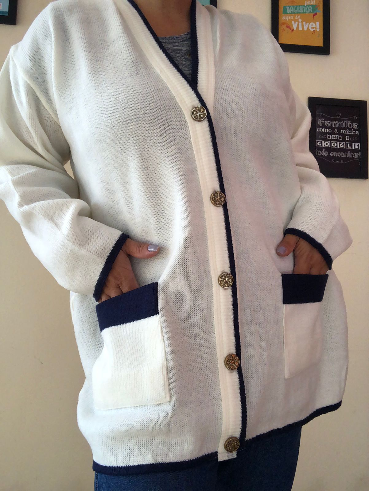 lindo cardigan vintage com cgc, bege claro com detalhe em azul marinho, está simplesmente impecável. lindo de viver, super estiloso e quentinho. para você que ama um look vintage está peça é para você, não perca!
