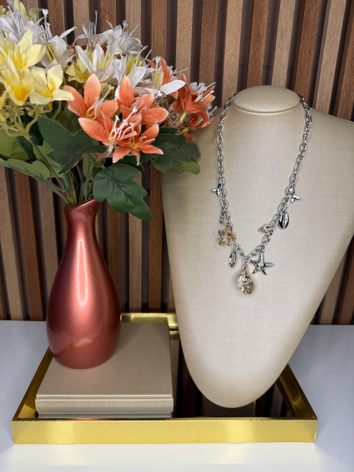 Com corrente de elos alongados, a peça é enriquecida com pingentes marinhos delicados, como conchas, estrela-do-mar e elementos naturais que remetem ao mar, criando um visual moderno e elegante.