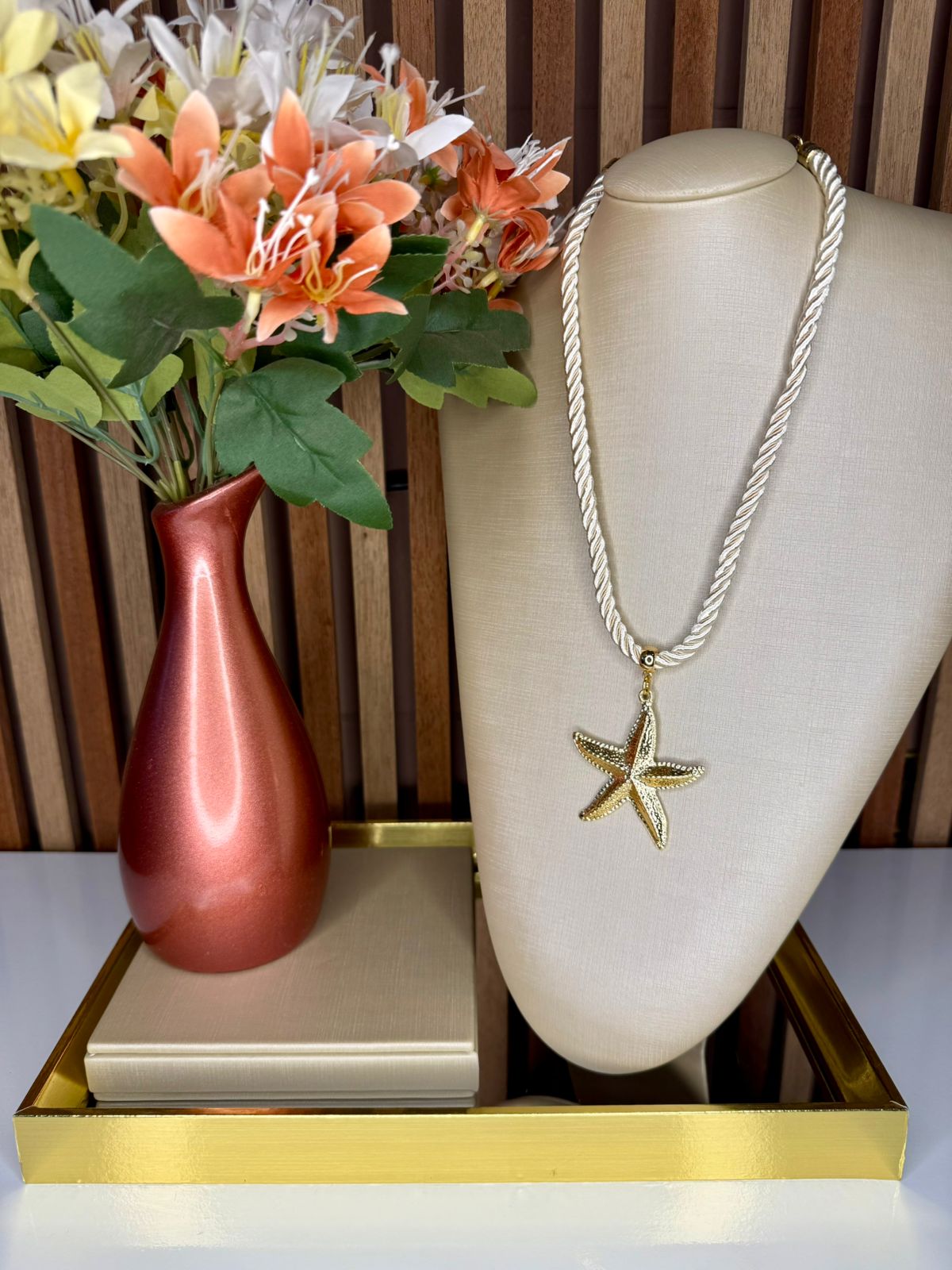O cordão torcido em tom claro confere elegância e destaque ao colo, enquanto o pingente de estrela-do-mar dourada adiciona charme e personalidade à peça. Um acessório versátil que valoriza desde produções mais leves até looks mais elaborados.