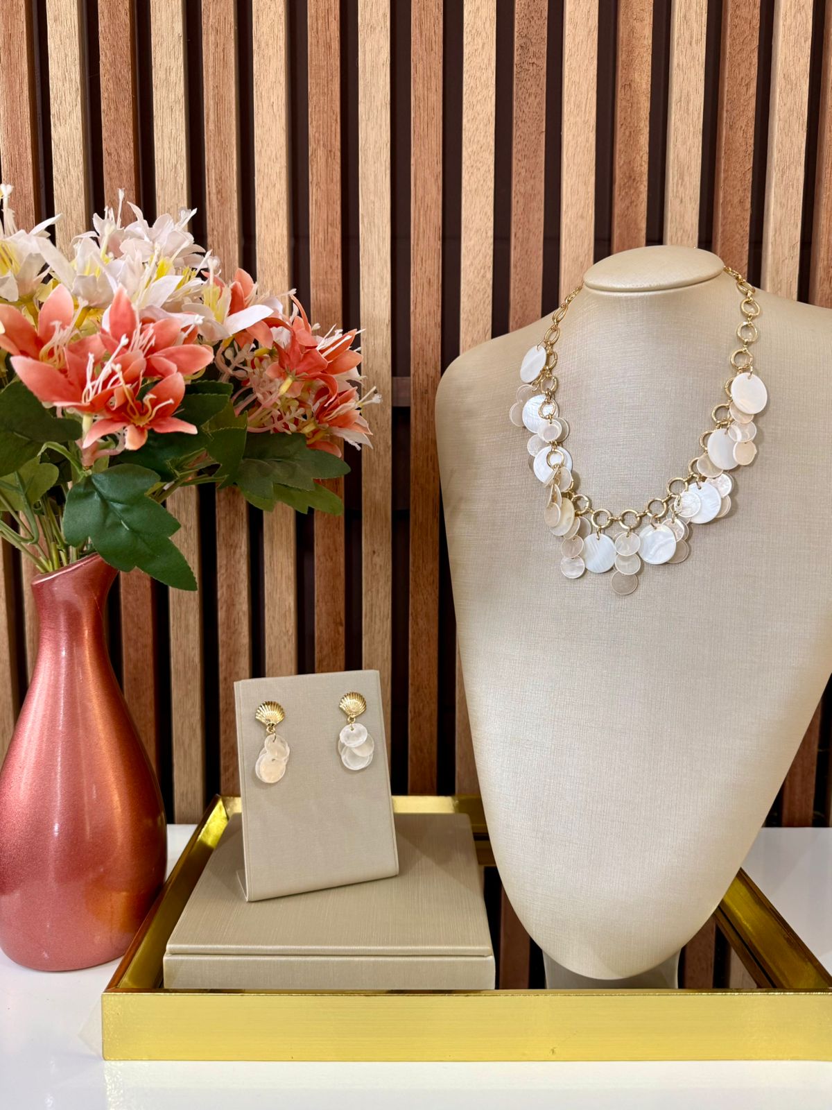 Composto por colar e brincos, este conjunto em bijuteria traz um design sofisticado, com detalhes delicados em tons claros e acabamento dourado, ideal para valorizar qualquer produção.