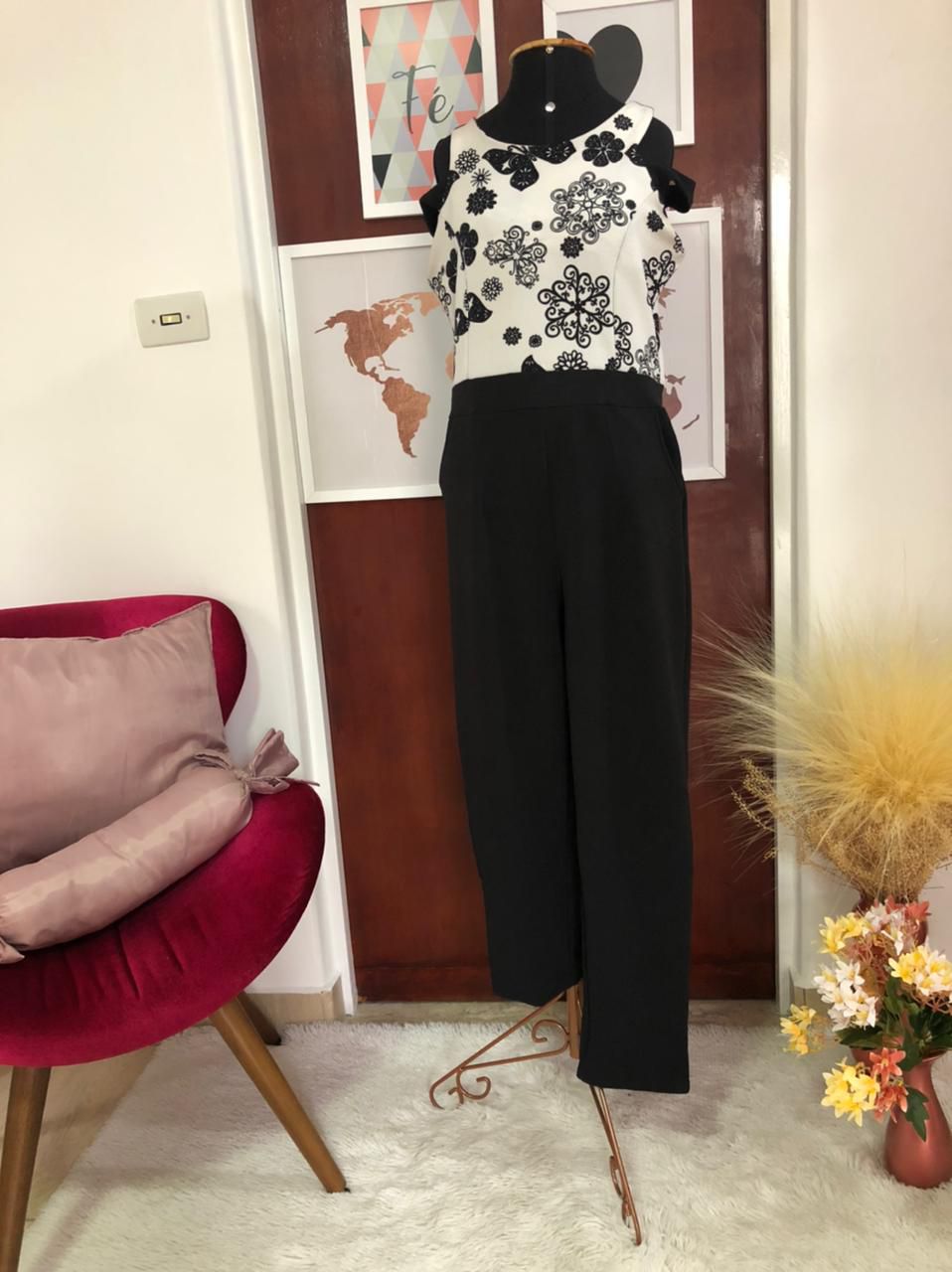 Lindo macacão estampado com zíper nas costas, tamanho G, veste manequim 42.