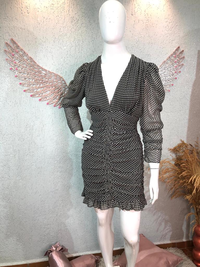 🌷Lindo vestido da marca Zara, com estampa em preto e bege, tamanho M. O vestido tem mangas bufantes, com detalhes drapeados com elástico e babado na parte inferior. O tecido tem leve transparencia apesar do forro interno. Não tem elasticidade.