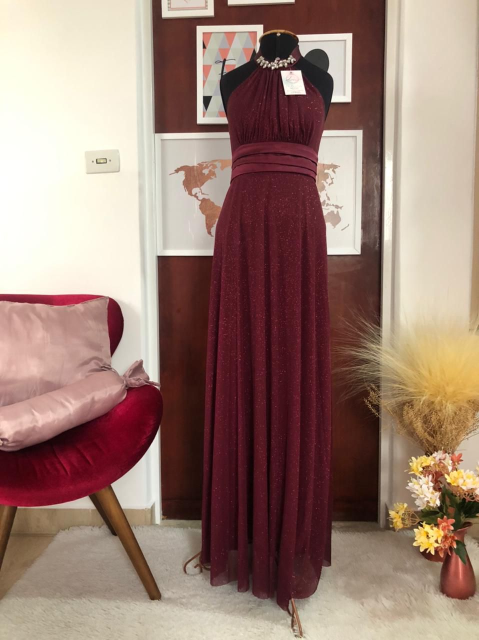Lindo vestido de festa com leve brilho e detalhes em pedras no pescoço, tamnho P. Veste manequim 38.